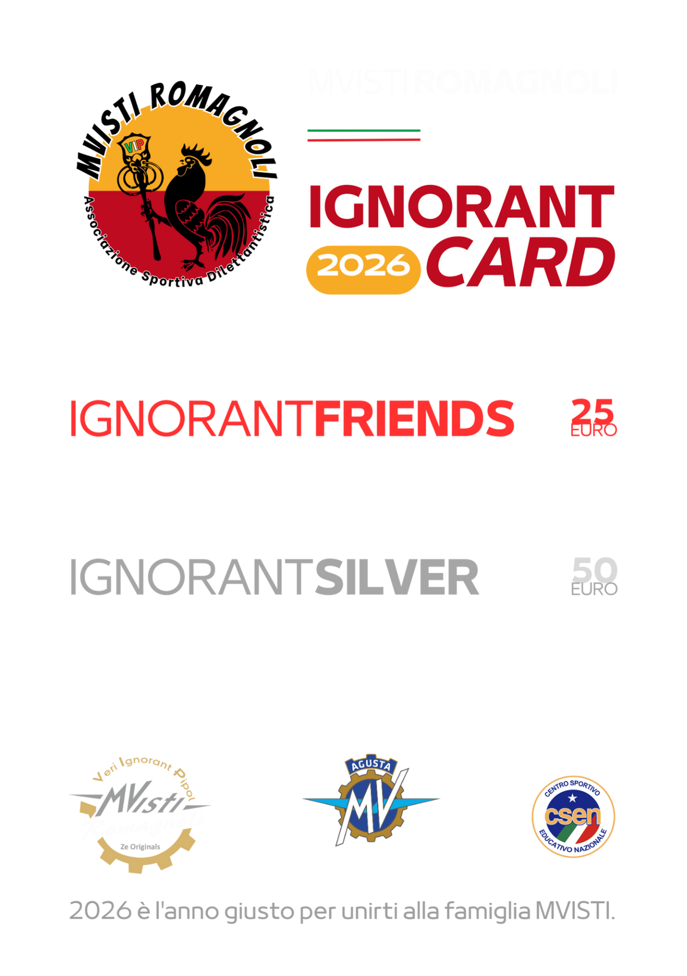 E da oggi abbiamo aperto il tesseramento 2026: puoi scegliere tra due tipi di IGNORANT CARD, la nostra tessera ufficiale, pensata per chi vuole vivere l'associazione con il giusto spirito… quello ignorante quanto basta.